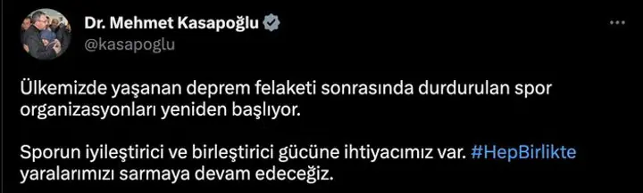 Sporun iyileştirici ve birleştirici gücüne ihtiyacımız var. #HepBirlikte yaralarımızı sarmaya devam edeceğiz."