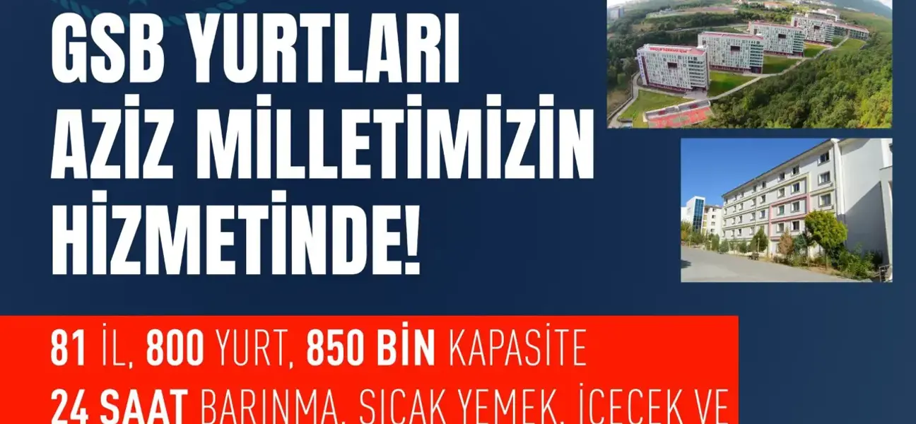 Gençlik ve Spor Bakanlığına ait ülke genelindeki tüm yurtlar 850 bin kapasite ile depremzedelerin hizmetine açıldı. Yurtlarda misafir edilen depremzedeler 81 ildeki yurtlarda, barınma, yemek, içecek gibi temel ihtiyaçlarını giderebilecek.